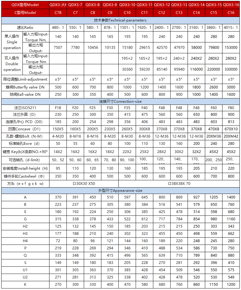 該系列是小蝸輪箱與大蝸輪箱對接組合成為二級傳動蝸輪減速增壓機構(gòu),提高了機械總效率,輸入小力矩,開動大閥門,使操作人員省力,每種型號提供多個傳動比,特殊型可輸出360°無限多回轉(zhuǎn),能更好的匹配不同規(guī)格的閥門。